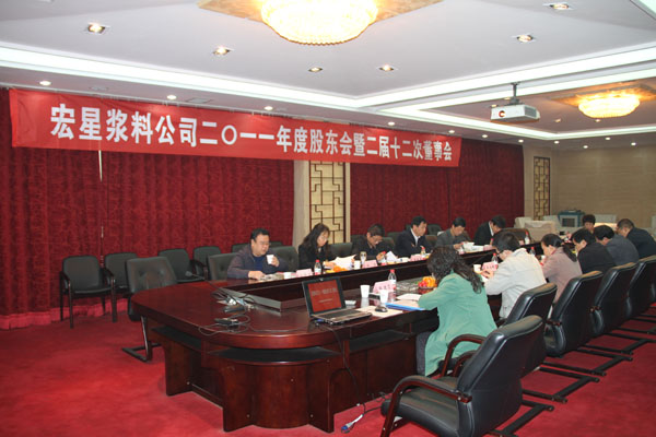 2012年3月30日,公司在西京生产力大厦三楼会议室召开二〇一一年度股东会暨二届十二次董事会,宏星浆料公司各股东方、董事、监事参加了本次会议,经营班子成员及财务负责人列席了会议。会议由董事长杨长印主持。